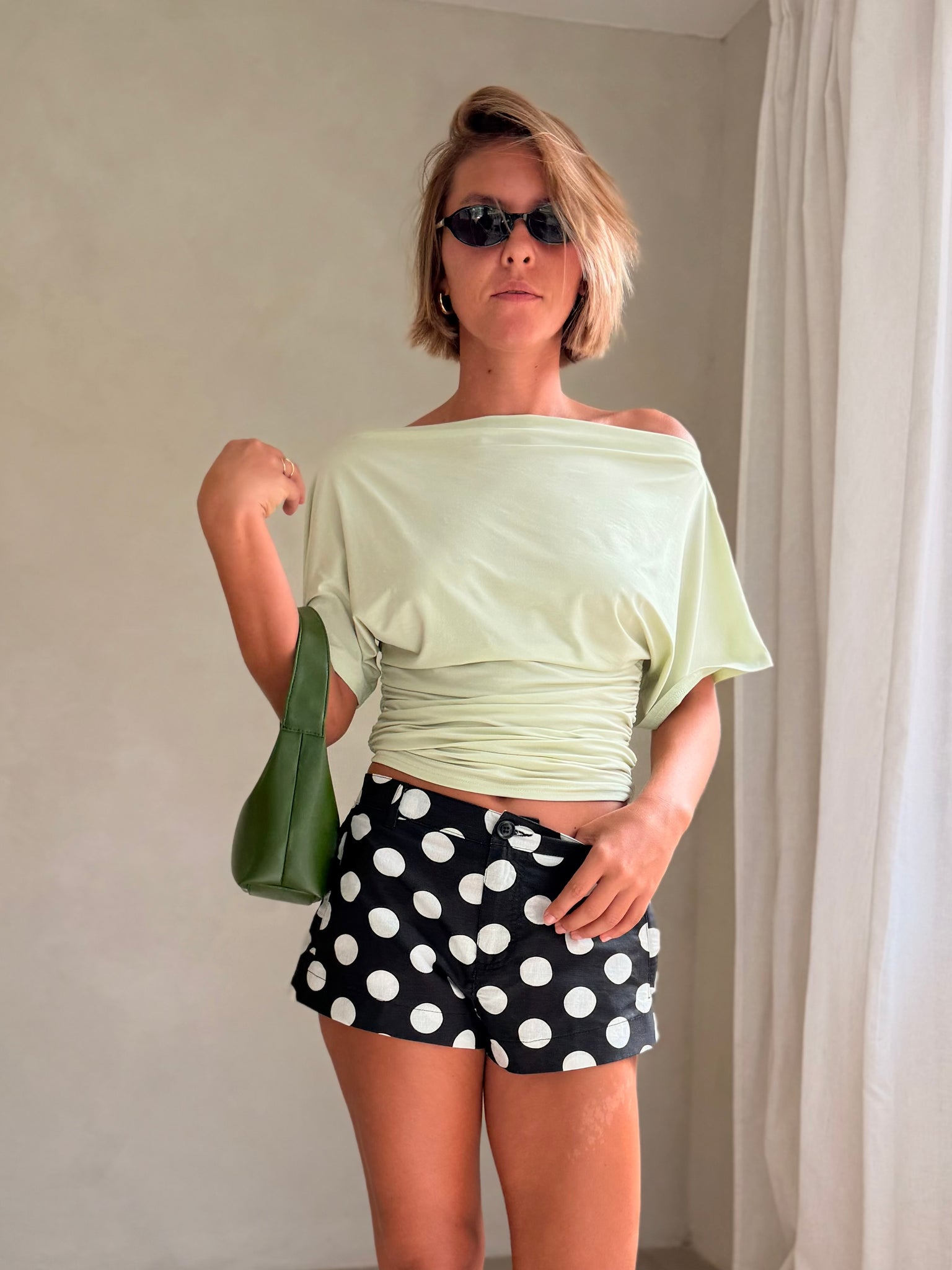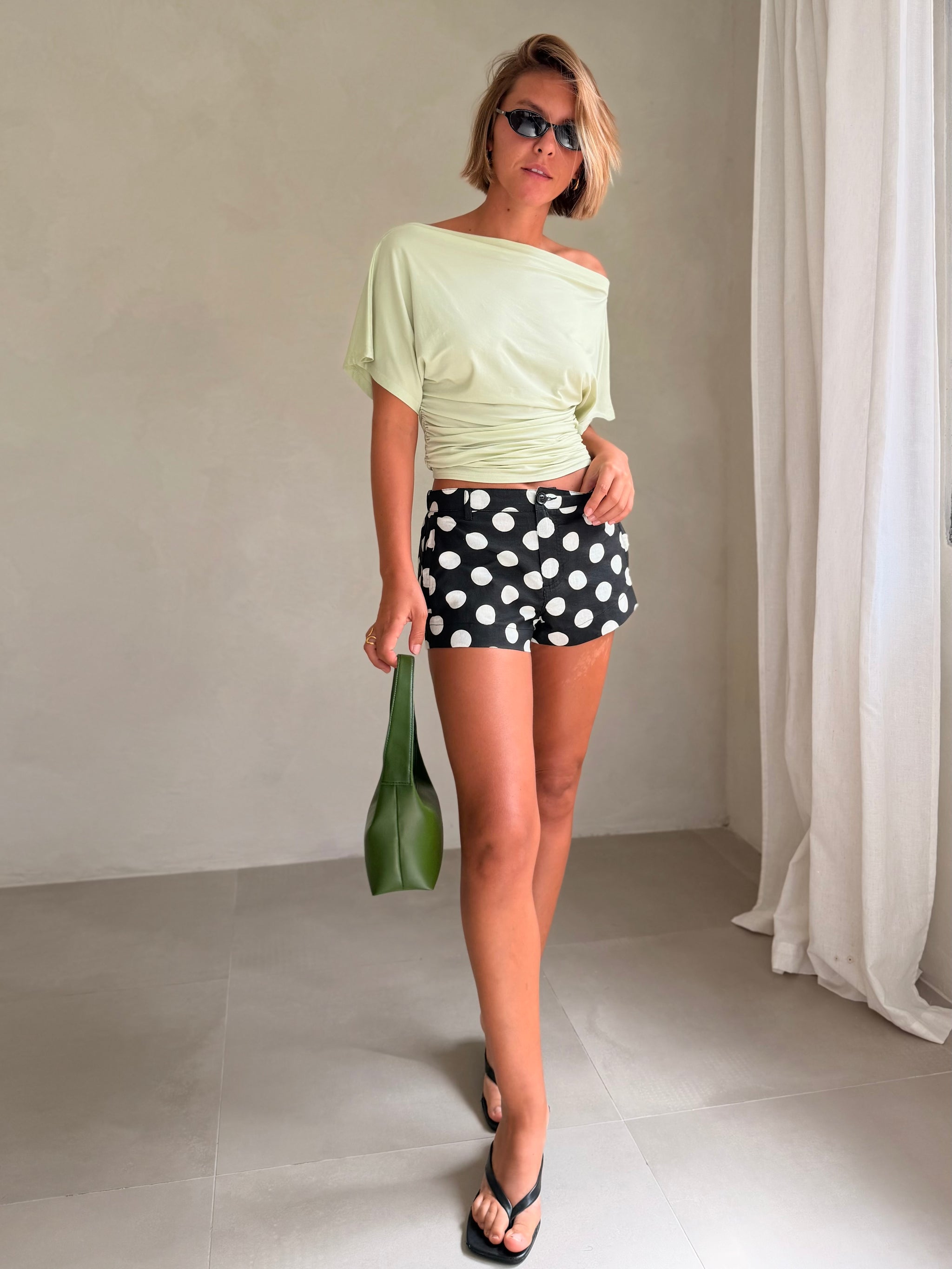 A playful yet polished high-waisted short in a bold oversized dot print. The Nadina short features a cotton linen fabrication with functional side pockets and a clean button-zip closure for a silhouette that pairs effortlessly with any top.