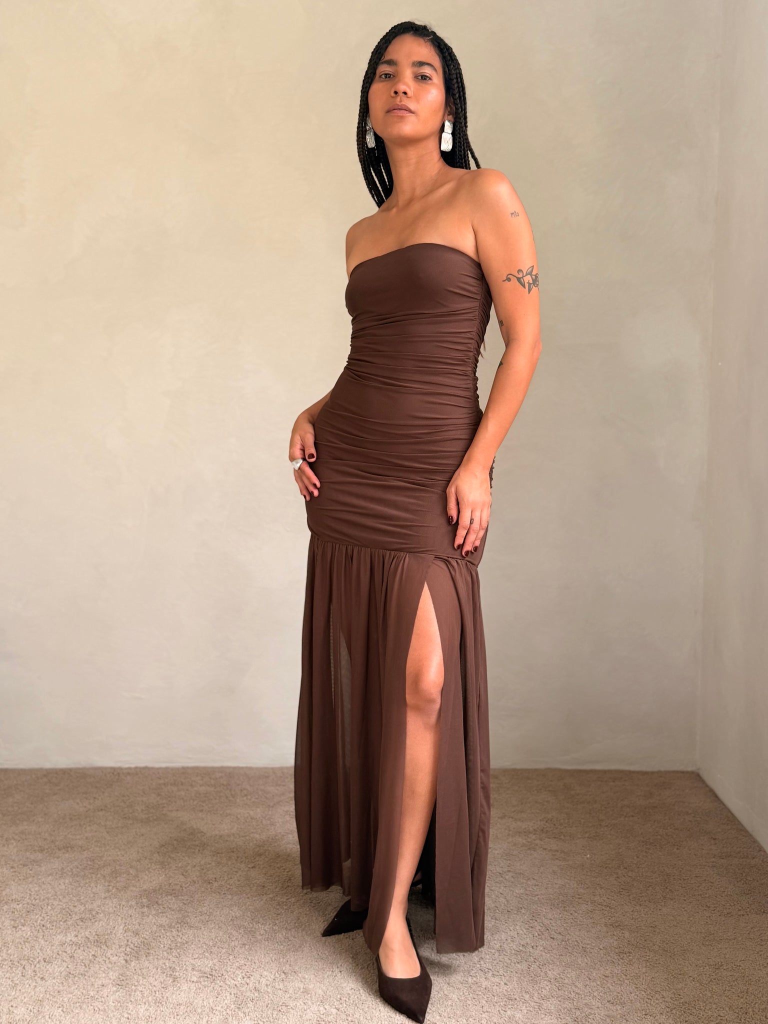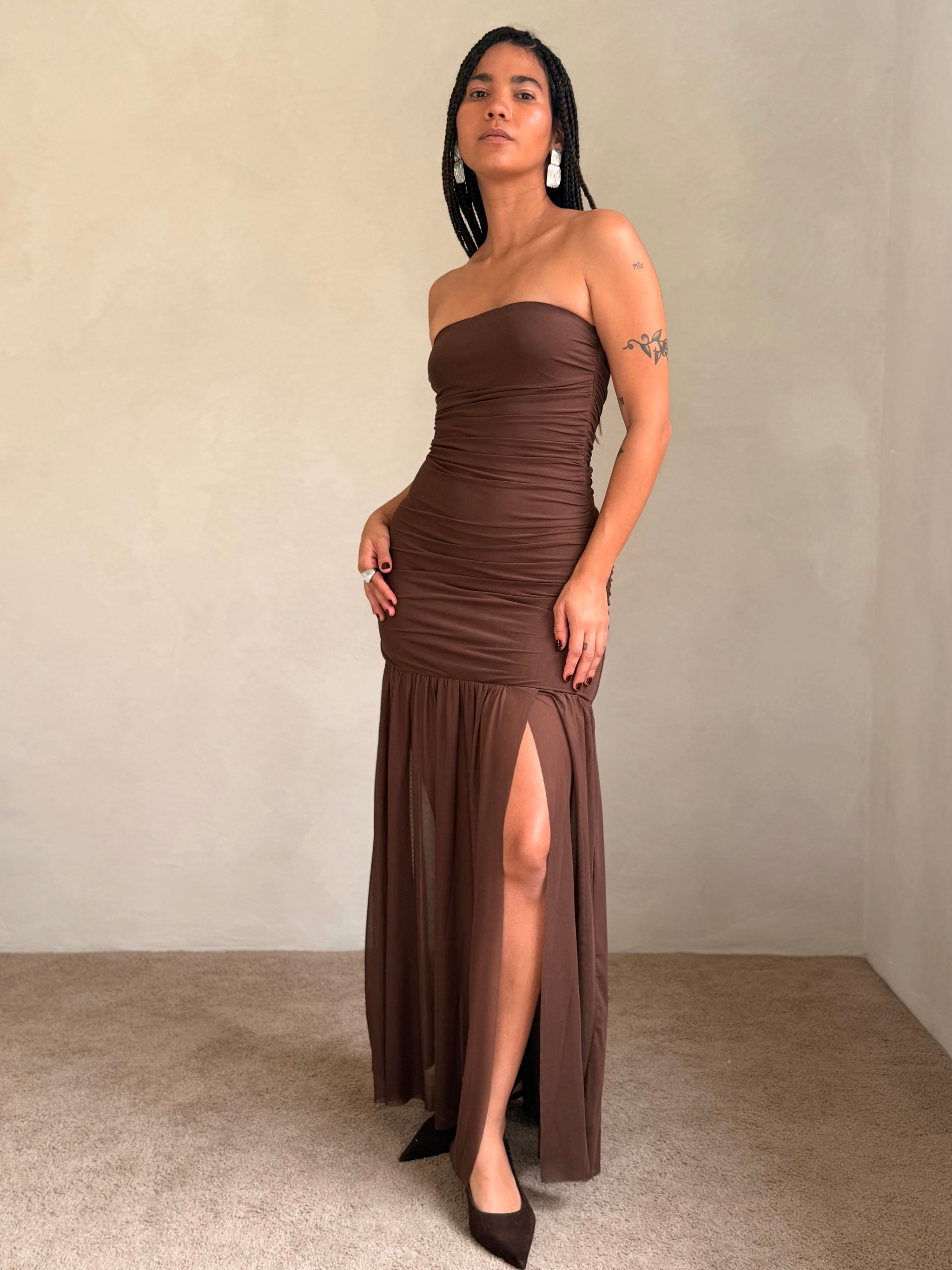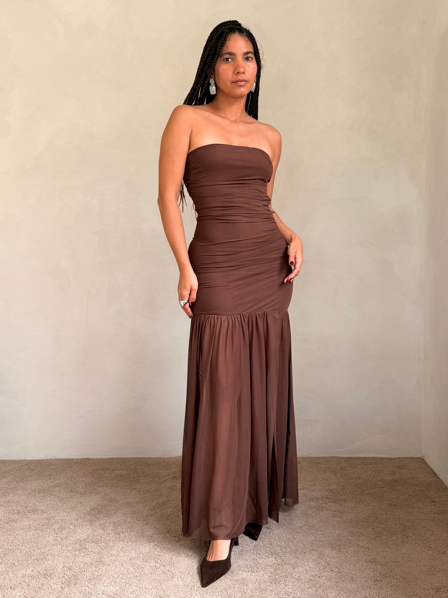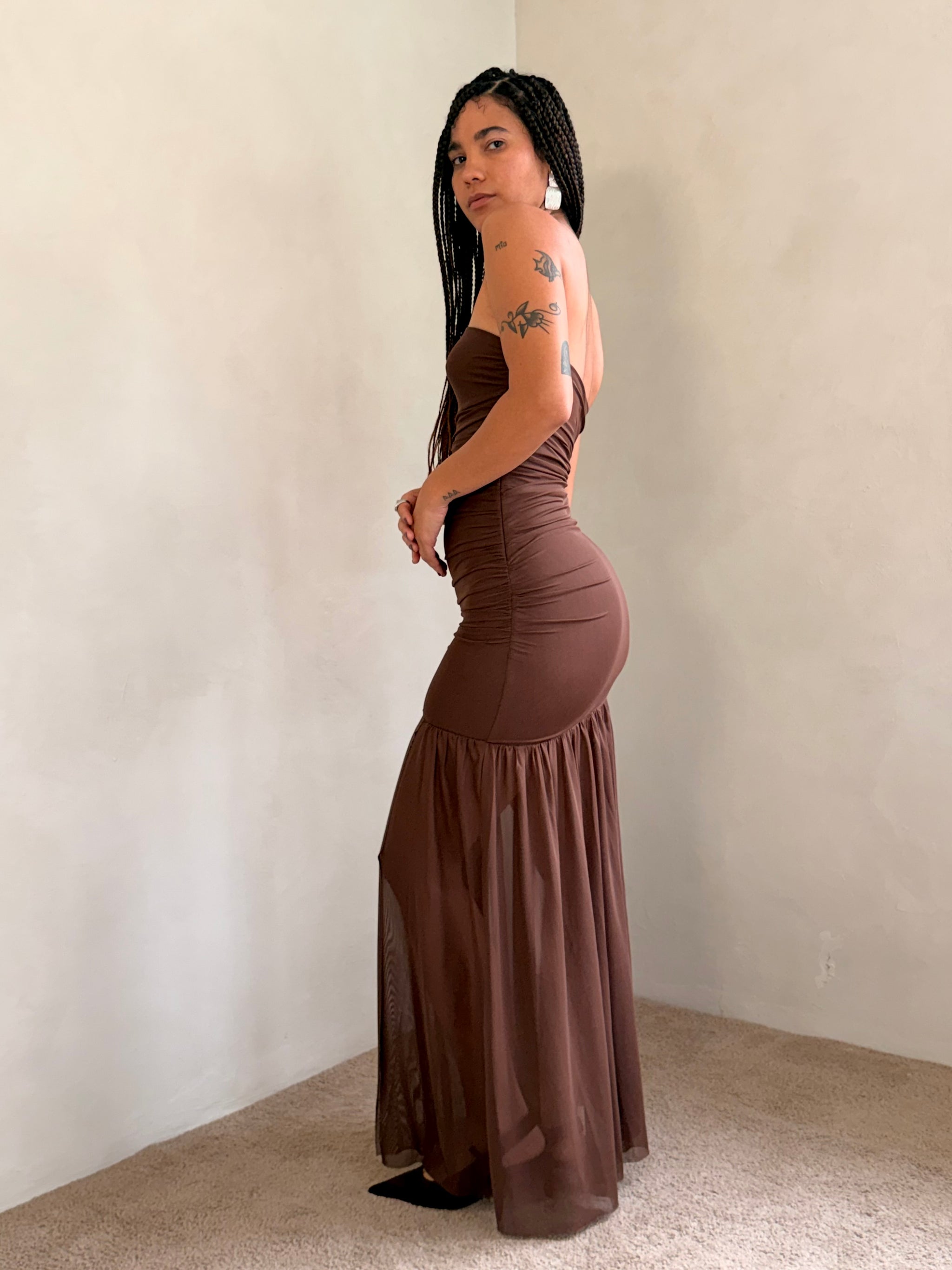 The Nola Dress is designed to contour and captivate. With a fitted column silhouette and straight strapless neckline, it hugs through the bust and waist before releasing into a flared, floor-grazing hem. Soft ruching enhances the bodycon shape, while the sheer mesh overlay adds fluid movement and layered dimension. Finished with a side zipper closure for ease.