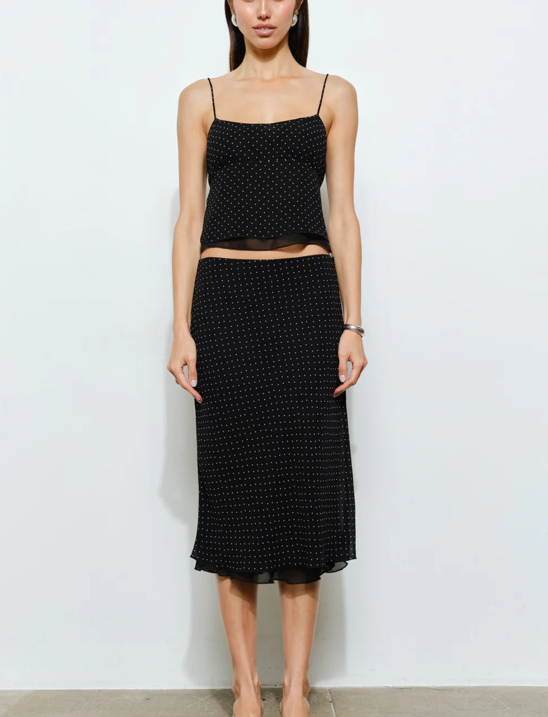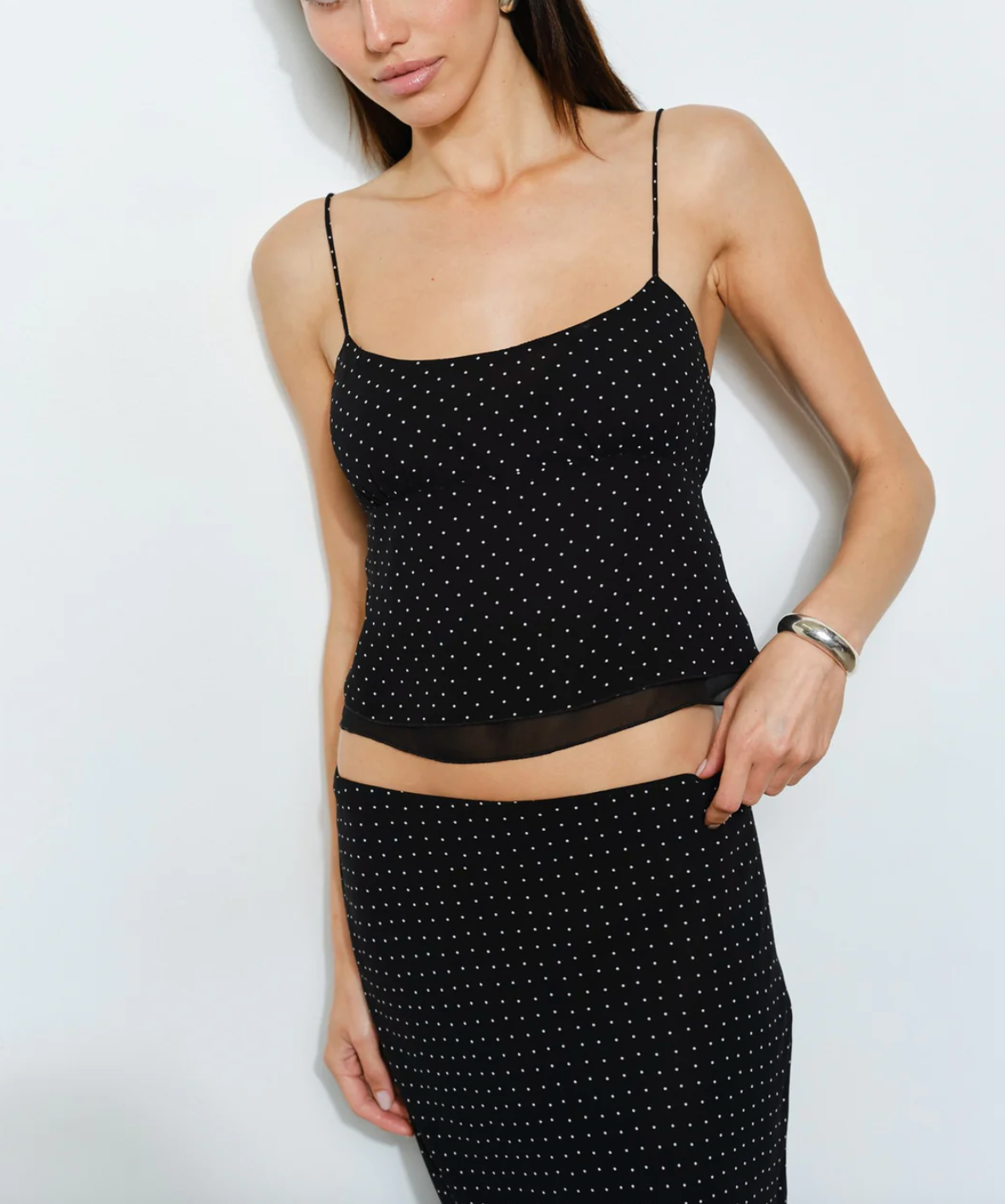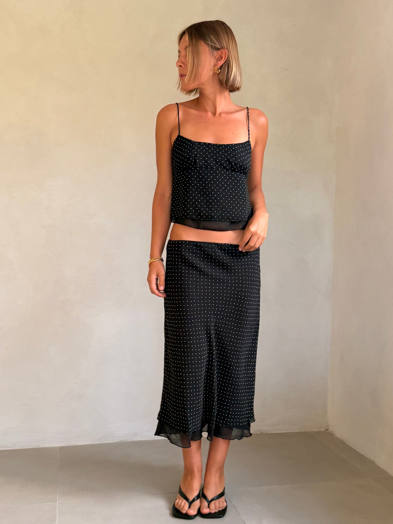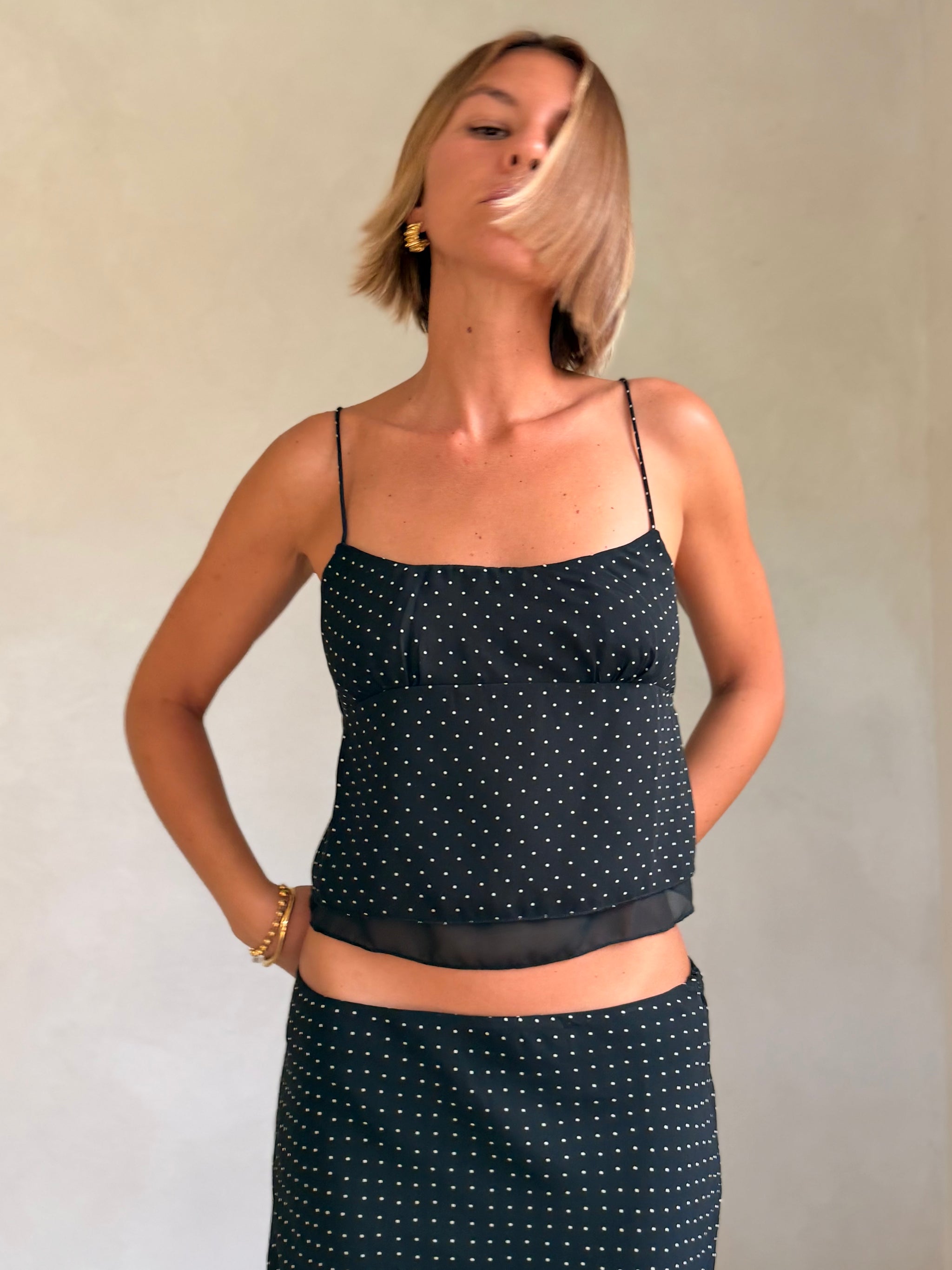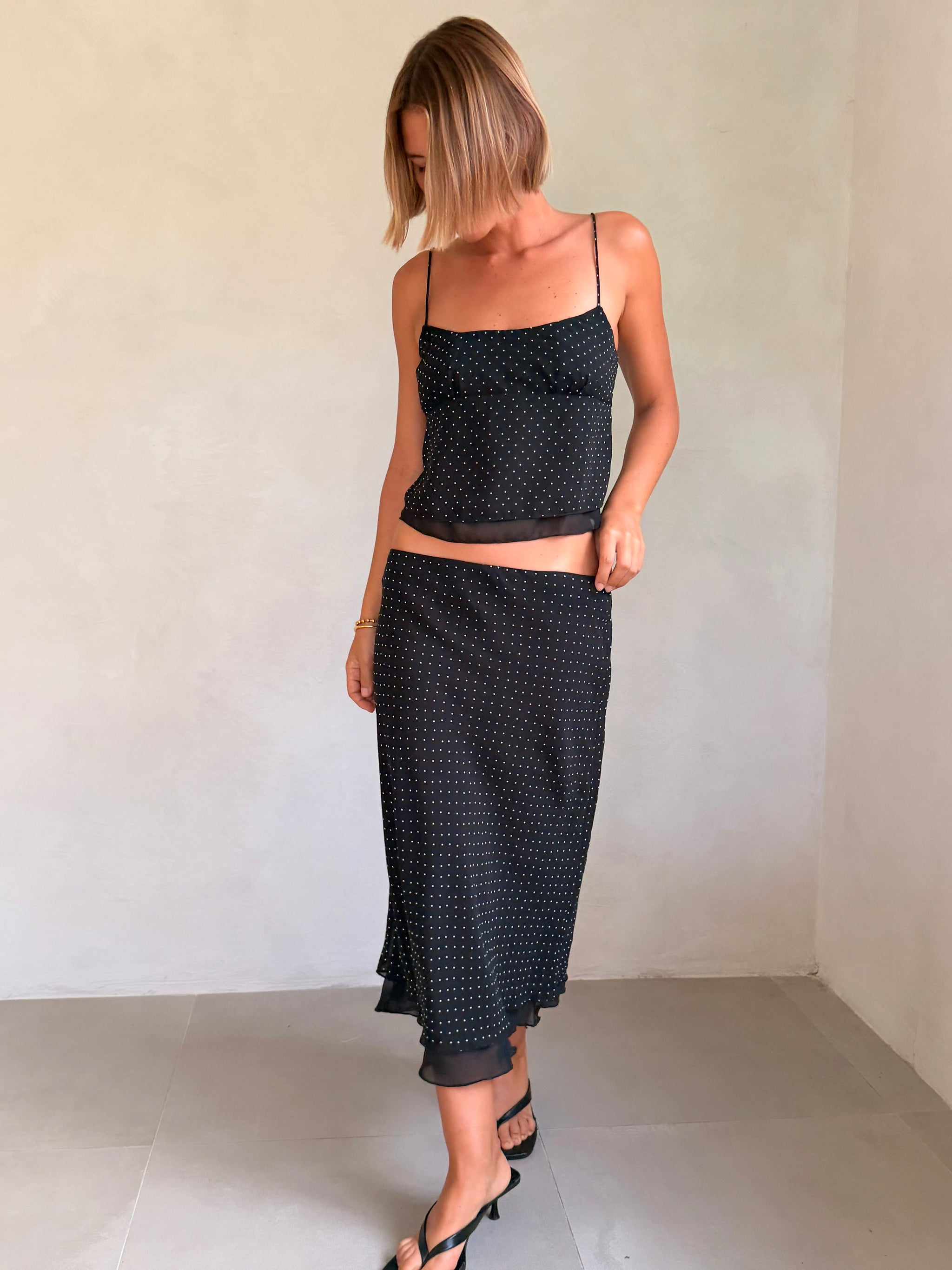 A playful yet sophisticated set, the camisole is adorned with a timeless polka dot pattern, fine spaghetti straps and a unique button-down back detail and delicate tie straps.